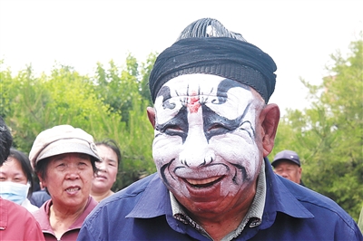▲广灵县非遗北岳庄秧歌剧团演员亢福亮在演出结束后,顾不上洗脸,又跻身观众席中,观看其他剧团的演出。开心的笑脸,给人留下深刻的印象。 赵武 摄