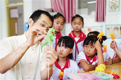 7月28日,在山东省齐河县祝阿镇马坊社区乡村“复兴少年宫”,王向东在教小朋友捏面塑。