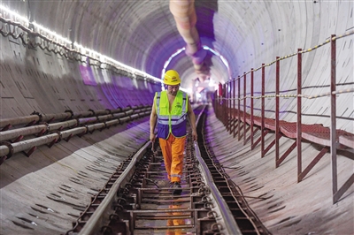 8月2日,建设者在广州地铁十号线东湖站至滨江东路站区间巡查盾构水平运输轨道。当日,中铁十一局施工的广州地铁十号线东湖站至滨江东路站区间盾构机双线安全下穿珠江航道。该区间隧道全长1260余米,下穿珠江航道600米。广州地铁十号线线路呈东北—西南走向,与多条线路形成换乘。新华社记者 刘大伟摄