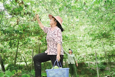 ◀8月3日,闽侯县洋里乡梧溪村村民李连俤(左)在采摘佛手瓜。