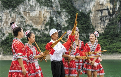 8月7日,在贵州省黔西市新仁苗族乡化屋村码头,苗族村民吹奏芦笙欢迎游客。