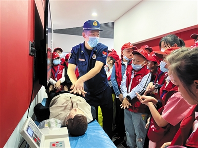 在消防教育馆内,小记者们参观了消防员常用的个人防护装备、常见的消防器材,了解了消防安全常识以及发生火灾时如何自救等知识;在参观消防车、消防设备时,消防员用通俗易懂的语言耐心地解说了每一样器材的名称、用途和使用方法,并现场进行操作示范。最后,消防员还指导大家穿上消防衣、坐上消防车,当了一回小小“消防员”。 李莎 摄
