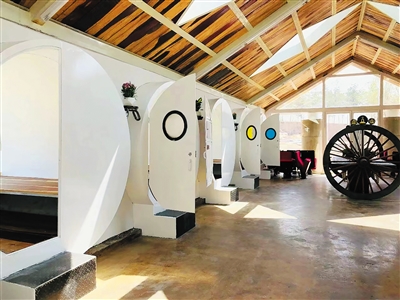 一块块木头桩子以各种姿势躺在宽阔的场地上,难道是没有整理的木料厂?带着疑惑探寻才是旅程最美的向往,爬个小坡,看到居然真的有“蜗牛”,不过这是只呈Y字型的钢铁蜗牛,用28个废旧水泥管拼装打造,每个水泥管外侧安装钢化玻璃采光,里侧利用废旧钢材制作隔离门,公寓屋顶利用废旧钢材、木材安装成型,公寓地面铺设有可控的碳纤维地暖采暖供热,废弃金属管焊接而成的巨型车轮原来是洗漱台。