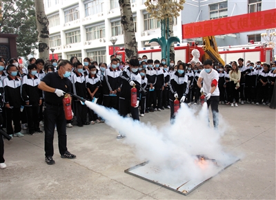 新学期伊始,为进一步增强学生消防安全意识,筑牢校园防火墙,9月2日下午,云冈区消防救援大队走进同煤二中,开展了消防安全进学校活动。图为该校师生在消防救援人员的指导下学习灭火器的使用。
