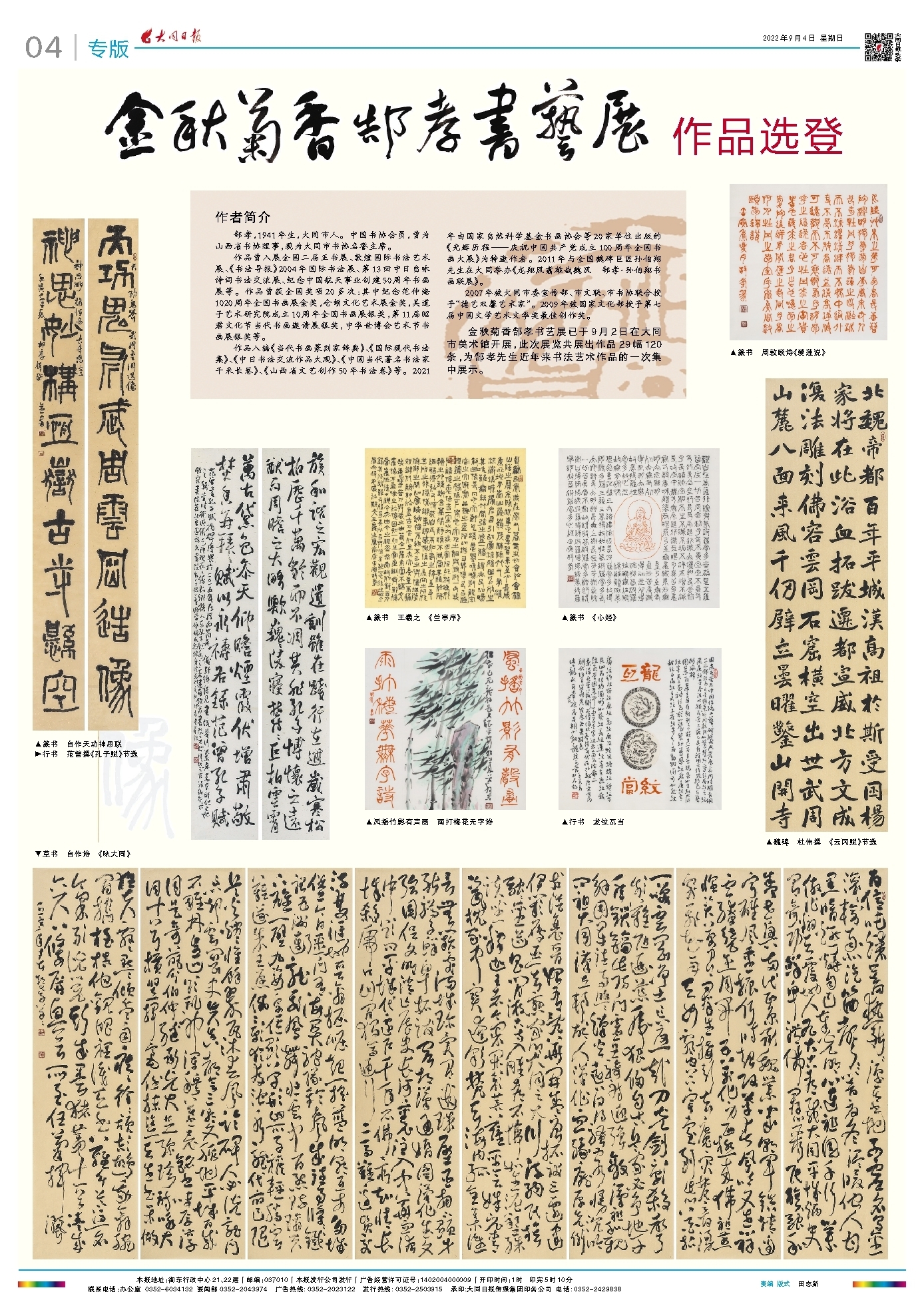 金秋菊香郜孝书艺展已于9月2日在大同市美术馆开展,此次展览共展出作品29幅120条,为郜孝先生近年来书法艺术作品的一次集中展示。