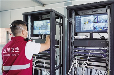 9月5日,核酸检测队工作人员在监控气膜方舱实验室内情况。