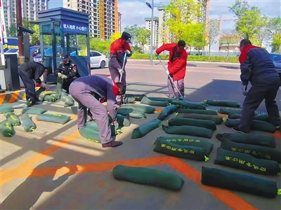 排查小区阳台,通知业主清理阳台花盆等杂物。在地下停车场布置防汛挡水沙袋,在居民微信群中发布天气预警,叮嘱居民注意安全,在各楼栋大厅张贴“小心地滑”标识等。