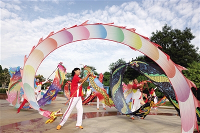 9月5日,“彩带龙”爱好者在山东省枣庄市市中区光明路街道一处“口袋公园”舞彩龙健身。
