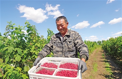 9月6日,在法库县登仕堡子镇西登仕堡子村树莓种植基地,农民在搬运树莓。