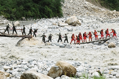 9月8日,在四川省甘孜州泸定县磨西镇附近,救援人员站在临时架设的小桥上向河对岸的村民运送生活物资。