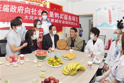 9月8日,平城区惠诚社会组织联合会联合开源街道民谐社区党支部在民谐社区开展“爱在中秋 情溢社区”活动。活动中,社区工作人员和居民欢聚一堂品月饼、吃水果、拉家常,共叙邻里情,并为老党员、行动不便的居民送去月饼、茶叶等慰问品,让他们感受到社区大家庭的温暖。 本报记者 于宏摄