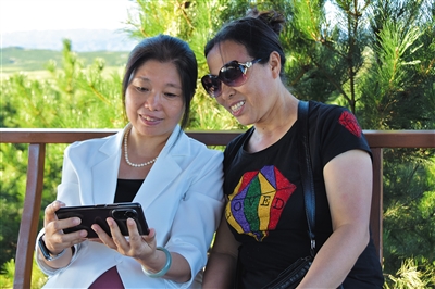 翻看旅游时拍摄的照片,俩姐妹多开心。 郭毅 摄