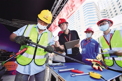 当日,福州轨道交通2022年质量月质量观摩会暨技能比武大赛在福州滨海快线福州火车站项目工地举行,来自福州轨道交通在建项目的50名建设者代表参加了钢筋直螺纹套丝、钢筋焊接、测量、现场质量检查等项目比赛,以弘扬工匠精神,促进工程质量进一步提升。 新华社记者 姜克红摄
