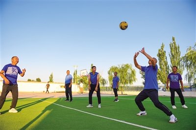 8月30日,农牧民们在内蒙古鄂尔多斯市鄂托克前旗昂素镇巴彦希里嘎查的排球场上打球。