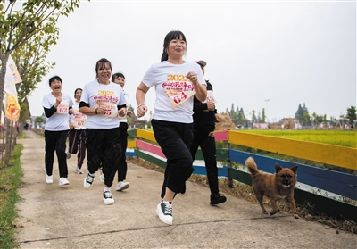 9月21日,在益阳市南县麻河口镇东胜村,当地村民和游客在参加“美丽乡村健康跑”活动。