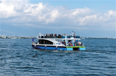当日,由大理旅游集团投资建造的新能源游船“风花雪月号”在云南省大理白族自治州洱海首航。相比传统燃油动力船舶,新能源“风花雪月号”游船将大大降低污染物排放,助力洱海生态保护。
