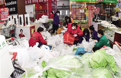 10月13日,我市某超市内核酸检测阴性工作人员正在抓紧分装平价蔬菜包,准备为社区居民配送。