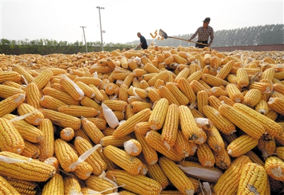 10月14日,河北省晋州市周家庄乡农民在晾晒收获的玉米。