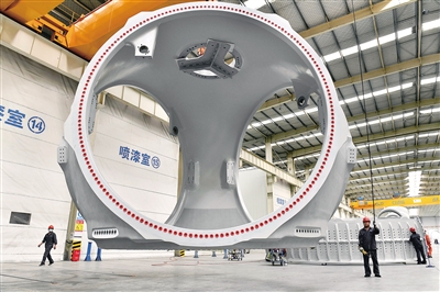 工作人员在山东省惠民县风电装备产业基地一涂装车间内作业(6月7日摄)。