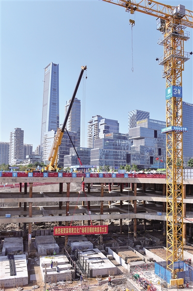 10月25日,在深圳湾文化广场建设工地,首块钢结构在吊装。当日,由中建科工承建的深圳湾文化广场项目钢结构开始吊装。深圳湾文化广场(深圳创意设计馆和深圳科技生活馆)项目位于深圳市南山区后海中心,总用地面积约5.08万平方米,总建筑面积约18.8万平方米,预计将于2025年建成启用。新华社记者 梁旭摄
