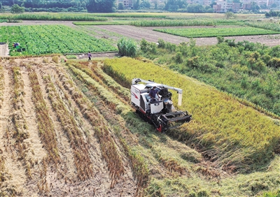 10月28日,农民在广西南宁市邕宁区蒲庙镇田园中劳作(无人机照片)。金秋时节,广西南宁市邕宁区蒲庙镇田园色彩斑斓,宛如调色板。新华社记者 周华摄