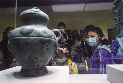 10月30日,小朋友在北京考古遗址博物馆琉璃河遗址馆区观看文物克罍。