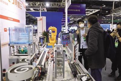 11月7日,参会企业工作人员介绍数字孪生系统全真模拟饮料灌装流水线。