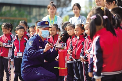 11月8日,在浙江省湖州市德清县武康街道一家幼儿园,消防员向小朋友讲解灭火器的使用方法。