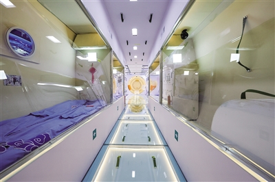 这是11月9日拍摄的中国空间站组合体展示舱内呈现的天和核心舱航天员睡眠区和卫生区。11月8日至13日,第十四届中国国际航空航天博览会(中国航展)在珠海举行。展会中,按真实比例1:1制作而成的中国空间站组合体展示舱成为展会上的观众打卡点。据了解,中国空间站以天和核心舱、问天实验舱、梦天实验舱三舱为基本构型,天和核心舱、问天实验舱、梦天实验舱呈“T”字基本构型结构分布。 新华社记者 刘大伟摄