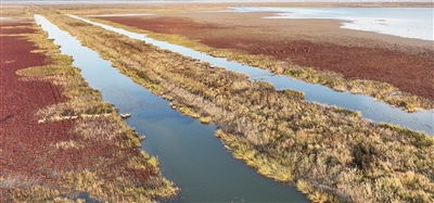 在盐城东台条子泥湿地拍摄的麋鹿(11月9日摄,无人机照片)。