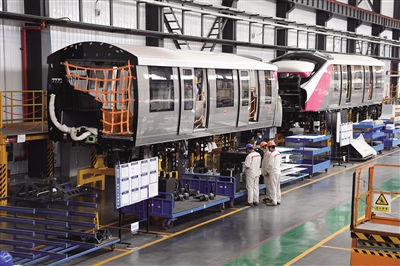 11月9日,中车浦镇阿尔斯通运输系统有限公司工人在轨道交通车辆生产线上工作。