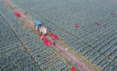 初冬时节,在安徽省蒙城县蔬菜基地,农民抢抓农时,采收西兰花等蔬菜,供应各地市场。近年来,蒙城县采取“龙头企业+合作社+村集体+农户”的合作方式,发展蔬菜生产,带动农民增收,助力乡村振兴。 新华社发 (胡卫国摄)