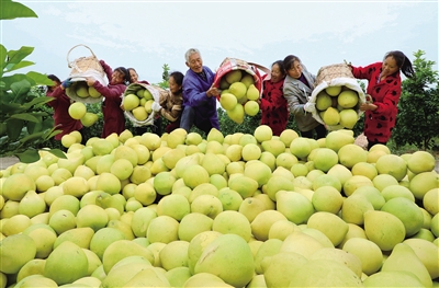 11月14日,四川省眉山市仁寿县汪洋镇五爱村蜜柚种植基地,村民在搬运蜜柚。