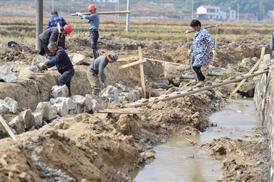 11月17日,在湘潭市湘乡市梅桥镇梅桥村,工人进行水渠改造作业。