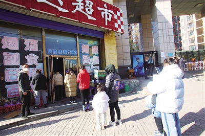 11月17日,平城区御河以西辖区解除静默管理,部分药店、超市恢复营业。各药店、超市严格要求市民佩戴口罩、扫场所码,查验健康码、行程码、核酸检测阴性证明,并限制一次进入的人数。图为平城区太安路某超市外市民正在有序排队进入。 本报记者 韩堃摄