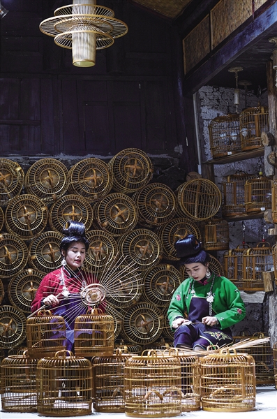 近年来,贵州省黔东南苗族侗族自治州丹寨县在巩固拓展脱贫攻坚成果同乡村振兴有效衔接过程中,把非遗技艺与乡村振兴有效结合,设立非遗工坊,采取“非遗+文创”的方式设计、制作旅游文创产品,推进苗族蜡染、银饰锻造、竹编鸟笼等非遗技艺的保护与传承,并为掌握非遗技艺的村民在村中提供创作、创业平台,实现就业。同时,通过线上+线下的方式展示当地非遗文化之美,让古老非遗技艺焕发新生机。图为在贵州省丹寨县龙泉镇卡拉村的鸟笼文创工坊,苗族手工艺人在编制鸟笼(11月16日摄)。 新华社记者 杨文斌摄