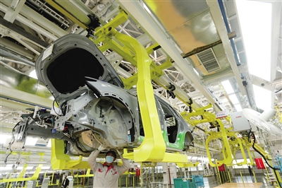11月18日,在位于青岛市即墨区的奇瑞汽车青岛基地,工人在总装车间检验底盘。