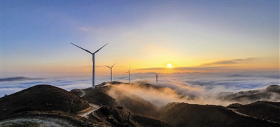11月20日,在湖南省桂阳县,风力发电机与云海景观相互映衬。 新华社发(周秀鱼春摄)