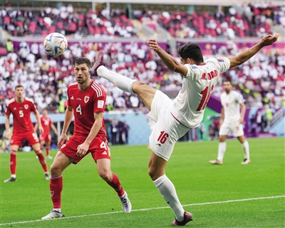 当日,在卡塔尔多哈艾哈迈德·本·阿里体育场进行的2022卡塔尔世界杯足球赛B组比赛中,伊朗队以2比0战胜威尔士队。 新华社记者 孟鼎博摄