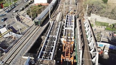 当日,有着百年历史的胶济铁路山东青岛海岸路段钢梁桥换梁顺利完成。据了解,该桥始建于1901年,因年代久远,梁体锈蚀、承载力衰减,存在一定安全隐患。铁路建设者通过仿真模拟、数据验算等技术手段,创新采用一体式换梁施工工艺,确保了旧梁拆除、新梁更换施工准确,为后续该路段列车安全通行提供了保障。 新华社记者 李紫恒摄