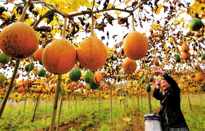 12月7日,江西省宜春市靖安县水口乡桃源村农民在采收吊瓜。