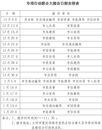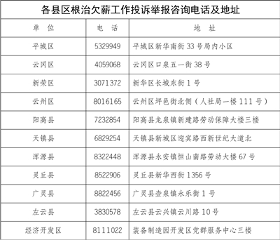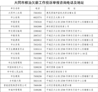 为密切沟通联系,依法解决各类欠薪问题,一并公布大同市根治拖欠农民工工资问题投诉举报咨询电话、根治欠薪联合接访地址和时间: