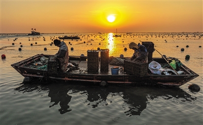近日,在山东荣成市各大海洋牧场,养殖船来往穿梭,养殖工人在海上开展冬管、育苗等作业。