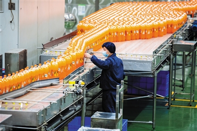12月13日,在长沙顶津食品有限公司饮品生产车间,工作人员在检查饮料品质。