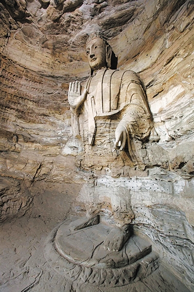 云冈石窟是北魏王朝的杰作,“昙曜五窟”当然是这部石头大书的开篇之作,是石破天惊的神来之笔。第20窟大佛当之无愧是云冈石窟的代表作,是云冈长卷的封面形象。“昙曜五窟”镌建的五尊大佛,高度都在13米以上,这种顶天立地的体势,集中体现了佛法无边、皇权至上的宗旨。
