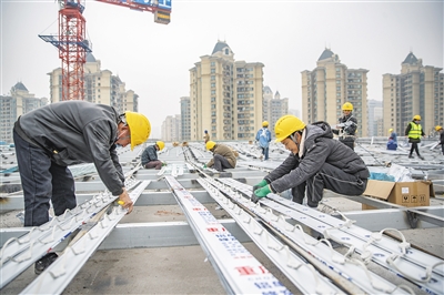 12月16日,在重庆市永川区西部科技影视基地项目,施工人员安装幕墙灯饰材料。