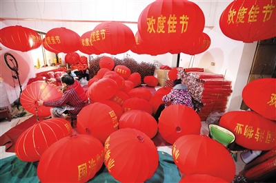 12月27日,在焦作市温县北冷乡许北张村一家灯笼作坊,村民在赶制大红灯笼。新年临近,河南省焦作市温县北冷乡许北张村灯笼作坊内一派忙碌景象,村民们加紧赶制大红灯笼,供应节日市场。 新华社发(徐宏星摄)