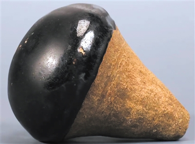 这件陶眼的形制略如圆锥形,呈水滴状。眼球前端直径11.5厘米,高14.4厘米,内胎呈土黄色,胎质疏松,肉眼可见细小气孔。陶眼前端半球体表层施以黑釉,金属质感强烈;尾端未施釉,自然包浆沉积,古意沛然。根据考古资料,这件陶眼可能是辽金时期被安装在石窟佛像上的。