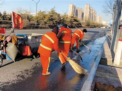 在清理路面积冰时,环卫工人们分工协作,对结冰路段抛洒融雪剂加速冰冻融化,并用铁锹将过厚的冰层砸碎,再将碎冰和融化的积水集中清理。环卫工人告诉记者:“每到气温骤降,就会出现不少路面跑水结冰的情况,发现后我们会第一时间汇报,并及时开展清理。”在清理积冰的同时,连日来,该处还加大道路清扫保洁力度,增加垃圾清运频次,加大消杀力度等,并提前做好扫雪除冰设备维护保养和除雪物资储备工作,干干净净迎接元旦的到来。