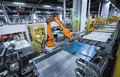 1月10日,在位于嘉兴秀洲光伏小镇内的一家科技有限公司,自动化流水线在生产光伏设备组件。